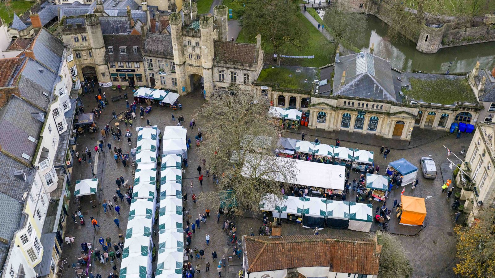 The annual Wells Christmas Market features over 100 festive stalls in the historic Market Place and the Cathedral Green, offering seasonal gifts, local food and drink, live music, and entertainment.